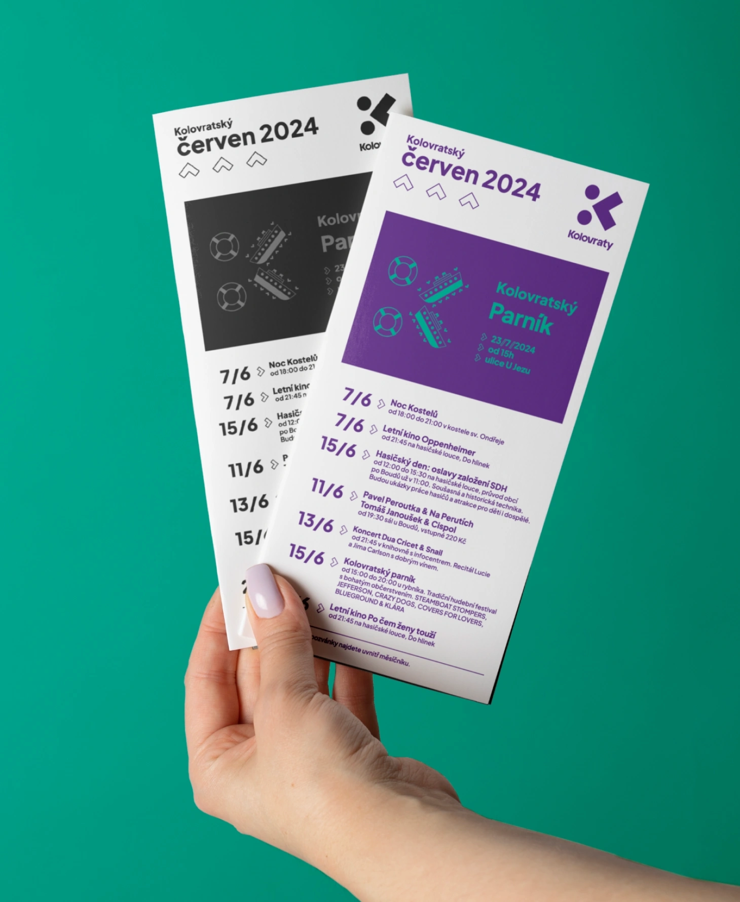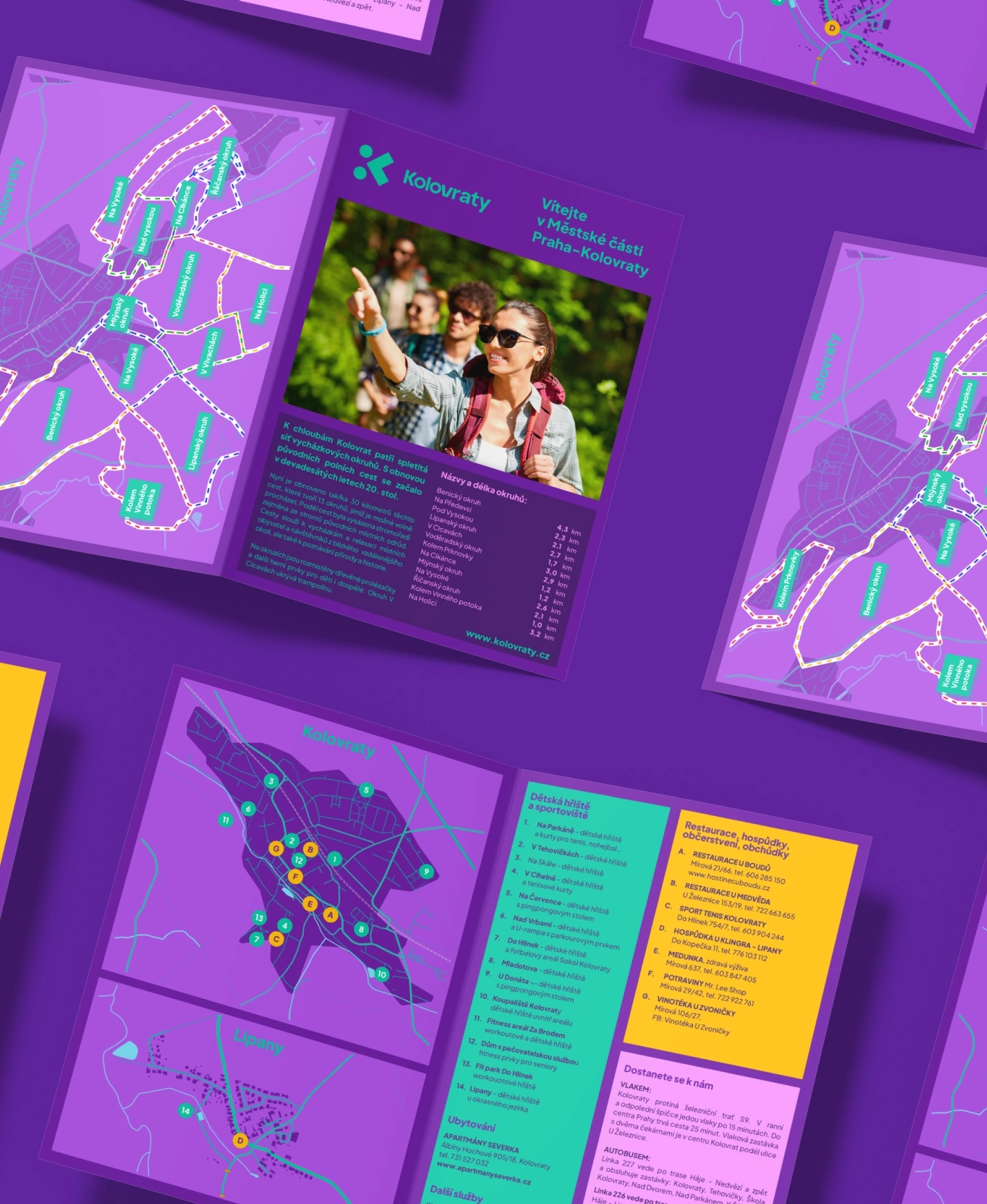 Z hromady aplikací, které jsme pro Kolovraty připravili, bychom ještě rádi vyzdvihli plakáty pro dětský den i Kolovratský parník, pozvánky na událost, informační brožuru s mapou Kolovrat i Lipan, nebo návrh zpravodaje a měsíčníku. Pro online komunikaci jsme jemně zrevidovali vzhled webových stránek a navrhli novou podobu facebookového profilu s coverem na událost i dalších příspěvků na sociální sítě.