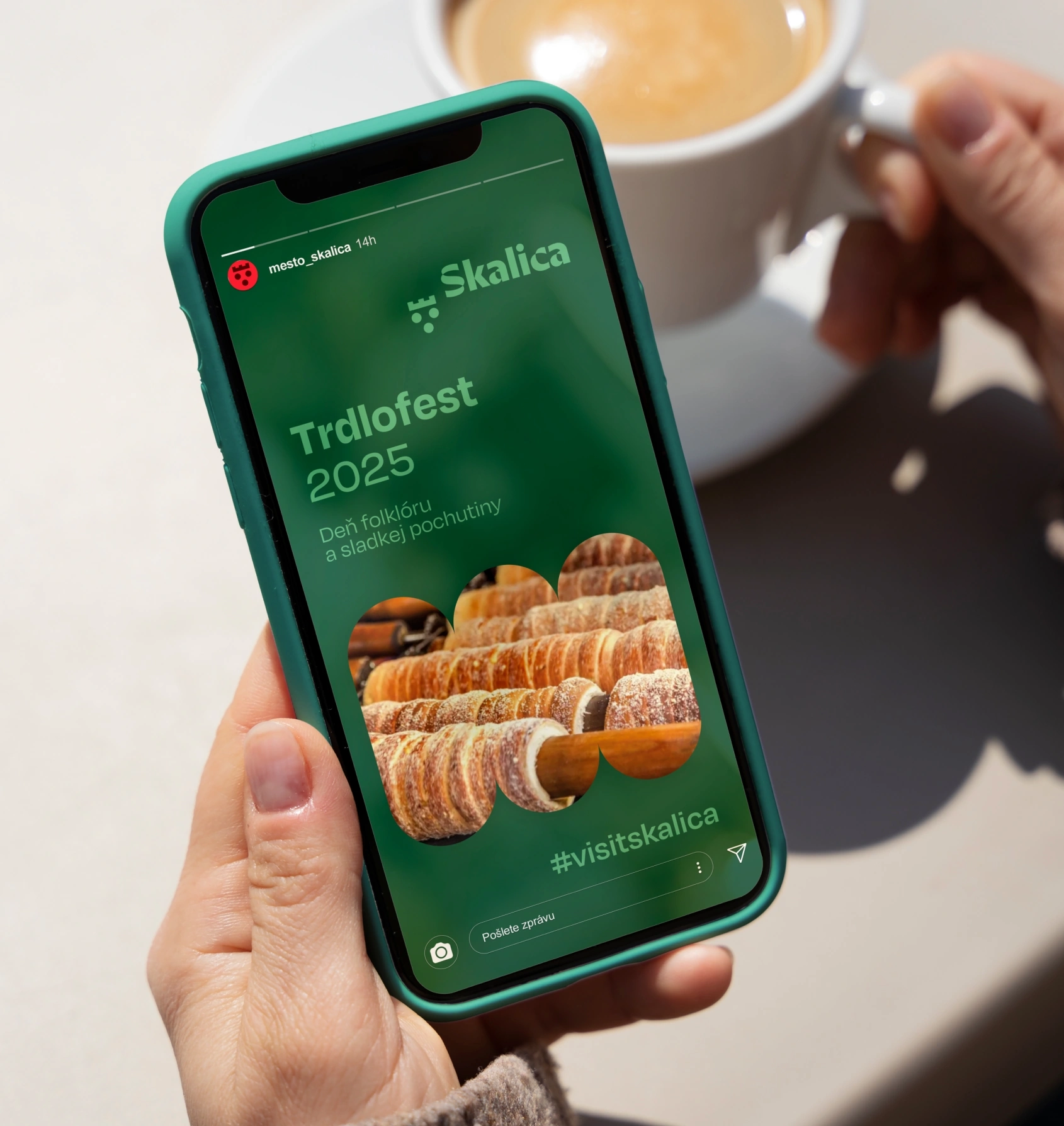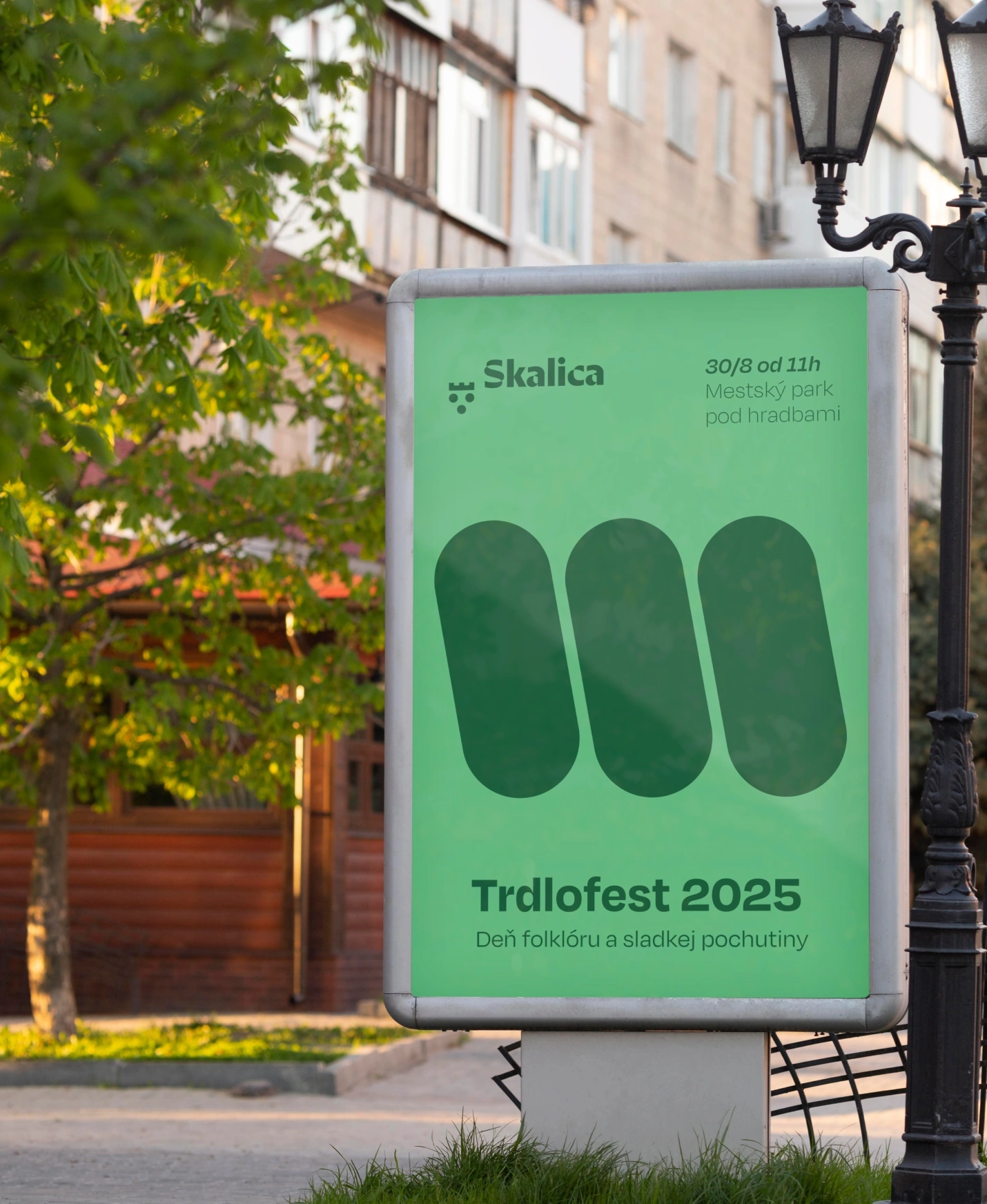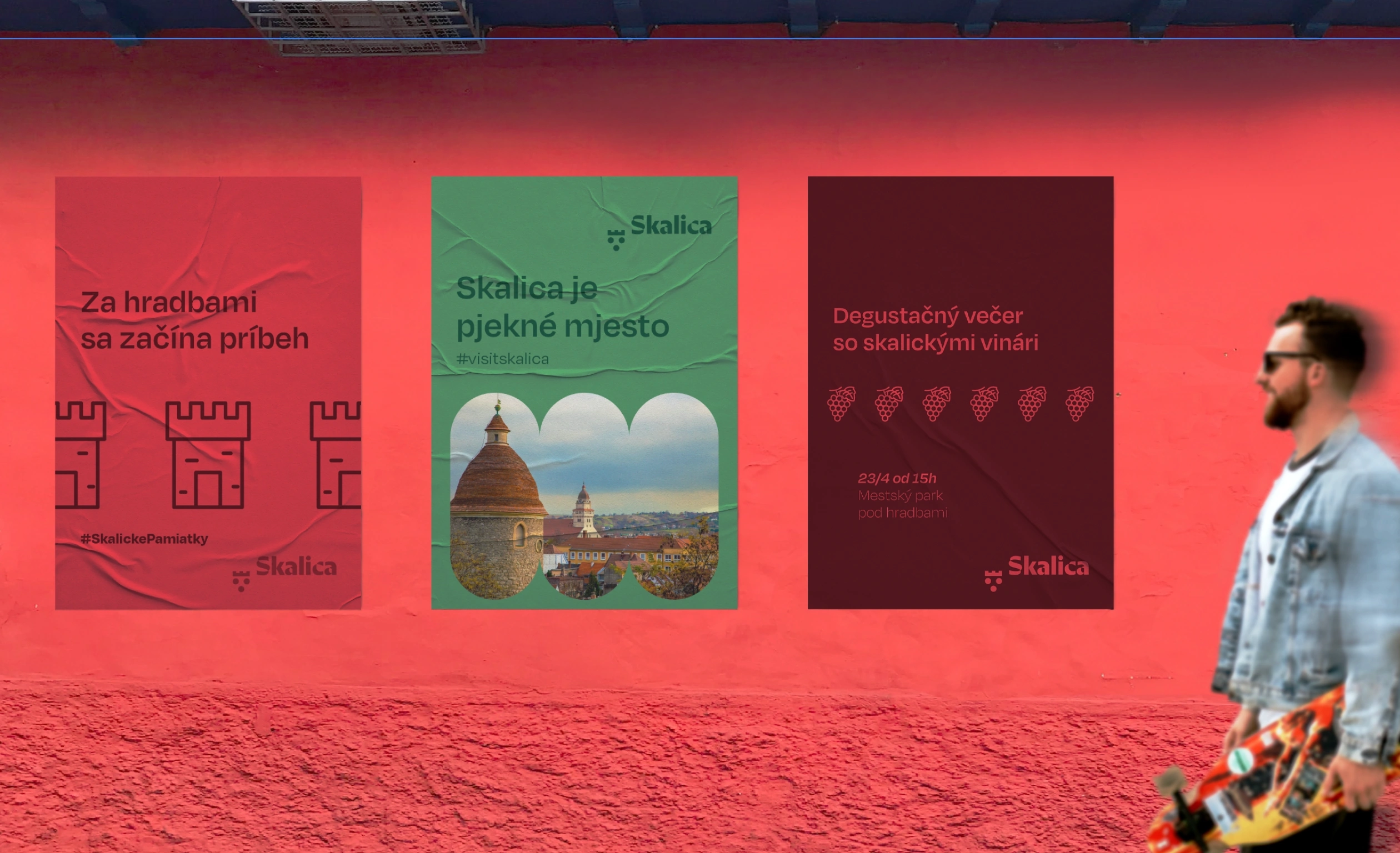 Barevná paleta respektuje základní skalické barvy – bílou, červenou a zelenou – ve vizuálně přitažlivých odstínech. Světlý odstín dokonale kontrastuje s tmavší variantou barvy, což umožňuje jejich společné použití v online prostoru i na plakátech. Ty obsahují mimo logo i hravé symboly hradeb a vinné révy. Roztažením generačních kruhů a hradeb vzniká tvar vhodný také pro výřezy s fotografiemi. V kombinaci s jednoduchým textem dosahujeme srozumitelného sdělení pro všechny generace.