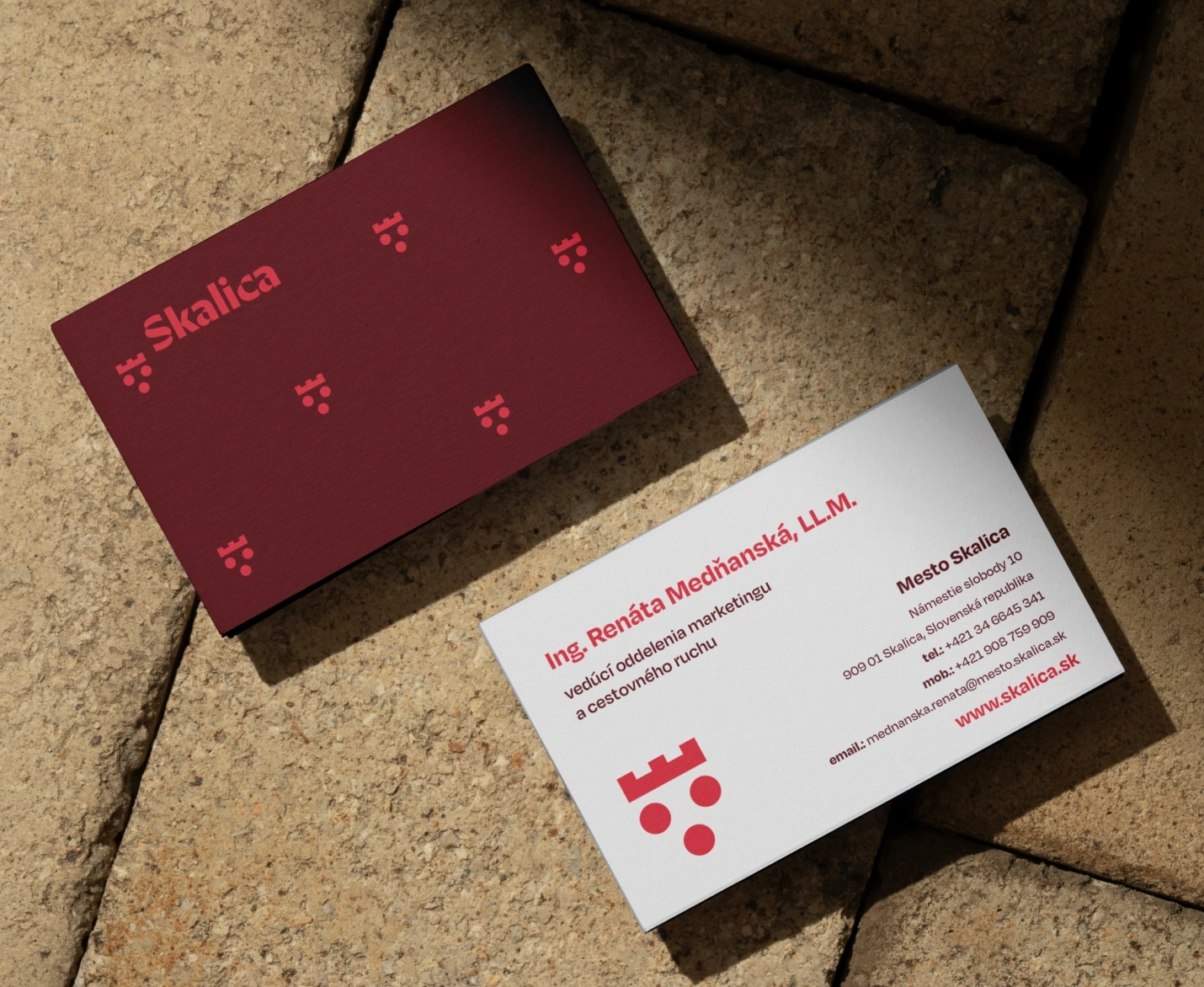Tím se po generace pěstovaný skalický rubín otiskl jako jmění vinoucí se zpod hradeb i do nového loga Skalice. Symbol doplňuje název města jako rovnocenný prvek, nebo menší doplněk symbolu.
